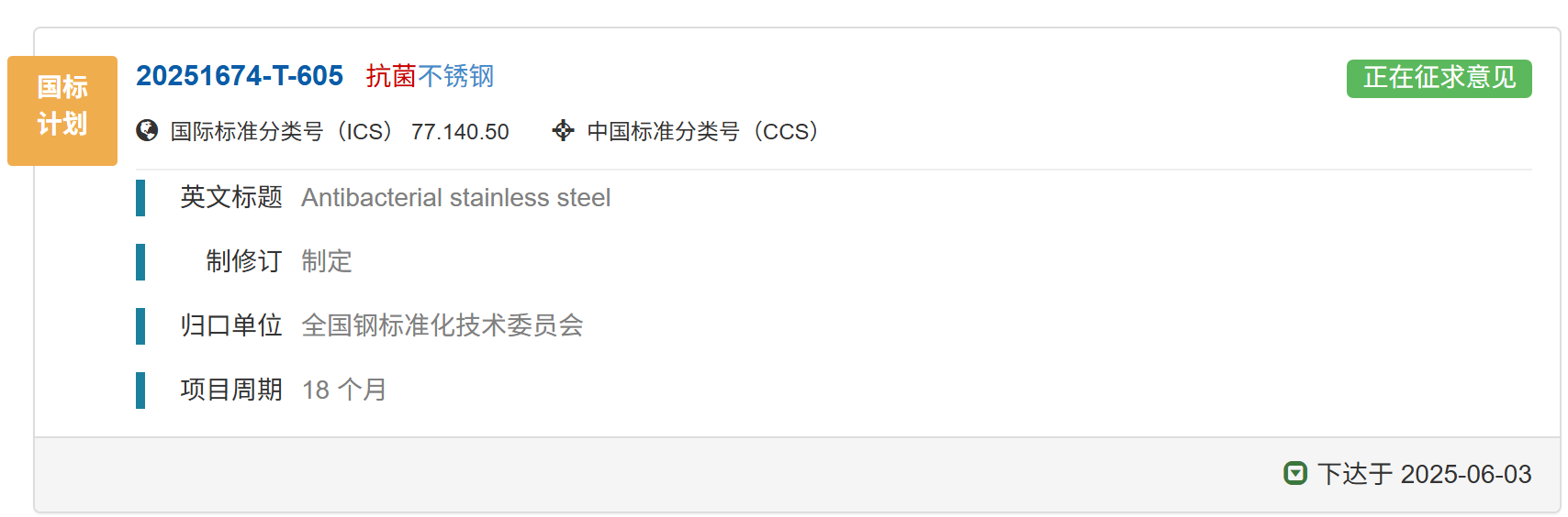 國家標(biāo)準(zhǔn)《抗菌不銹鋼》正在征求意見中,歡迎報名成為參編單位并提出修改意見和建議。01 國家標(biāo)準(zhǔn)計劃《抗菌不銹鋼》已下達(dá)國家標(biāo)準(zhǔn)計劃《